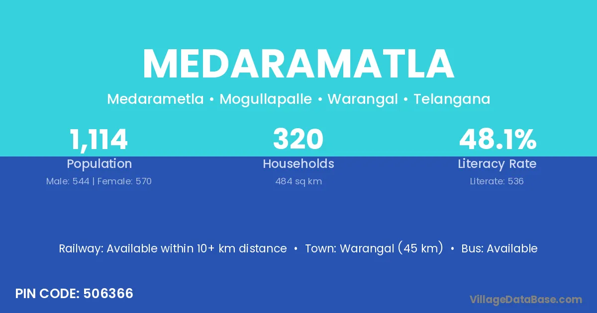 Warangal (45 km) is the nearest town to Medaramatla village for major economic activities and is located approximately 45 km away.