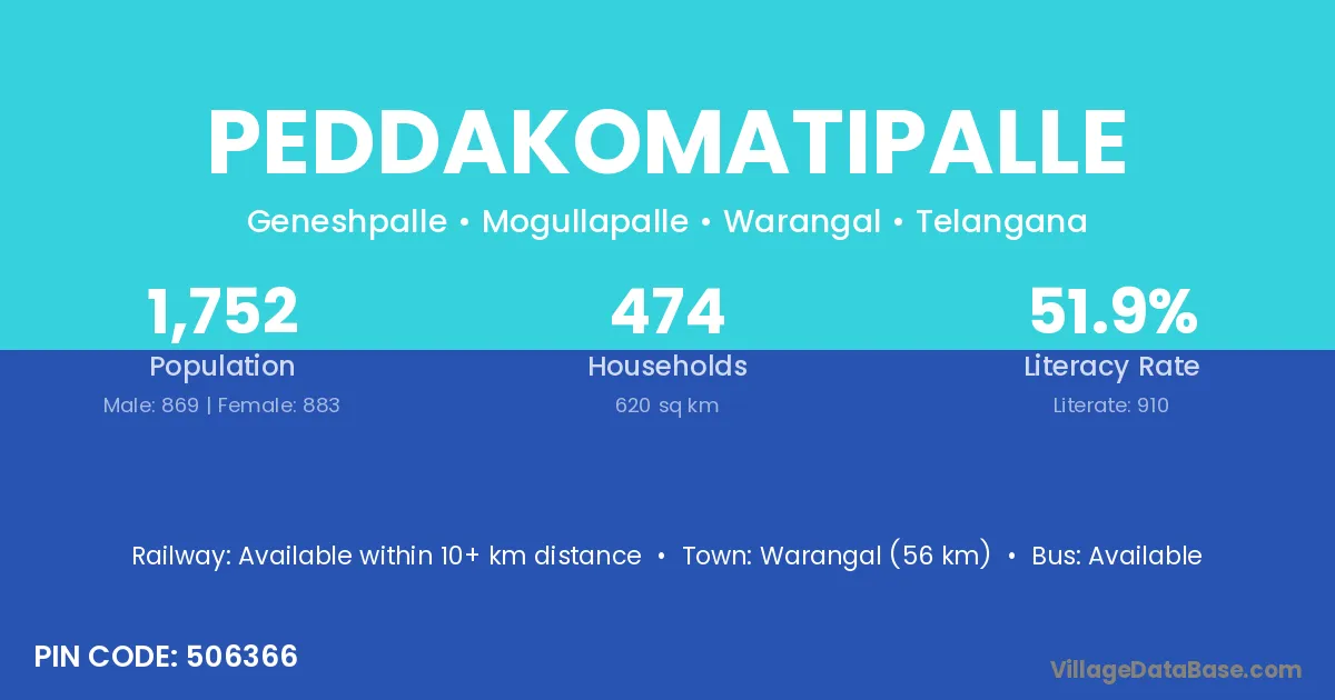 Warangal (56 km) is the nearest town to Peddakomatipalle village for major economic activities and is located approximately 56 km away.
