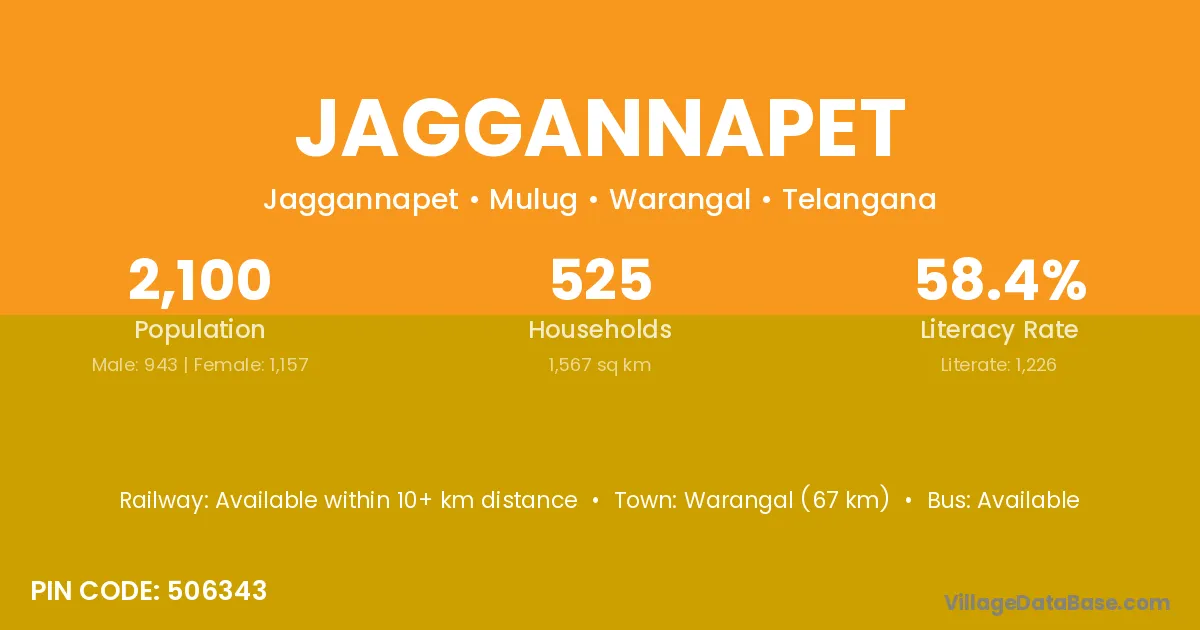 Warangal (67 km) is the nearest town to Jaggannapet village for major economic activities and is located approximately 67 km away.