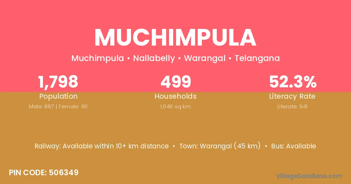 Warangal (45 km) is the nearest town to Muchimpula village for major economic activities and is located approximately 45 km away.