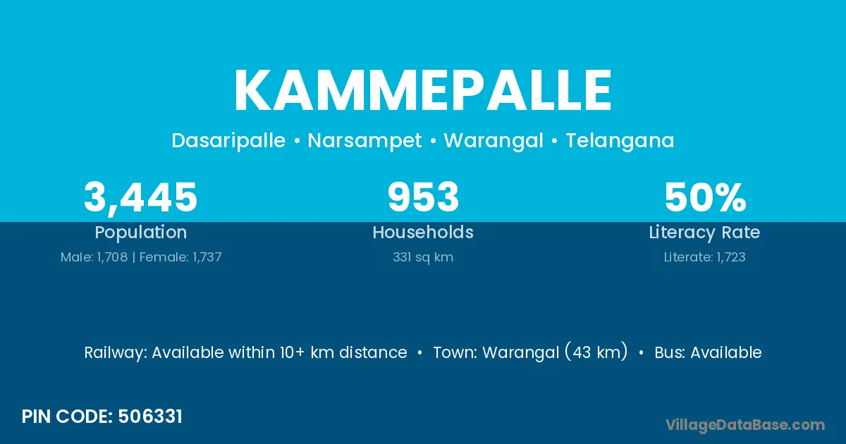 Warangal (43 km) is the nearest town to Kammepalle village for major economic activities and is located approximately 43 km away.
