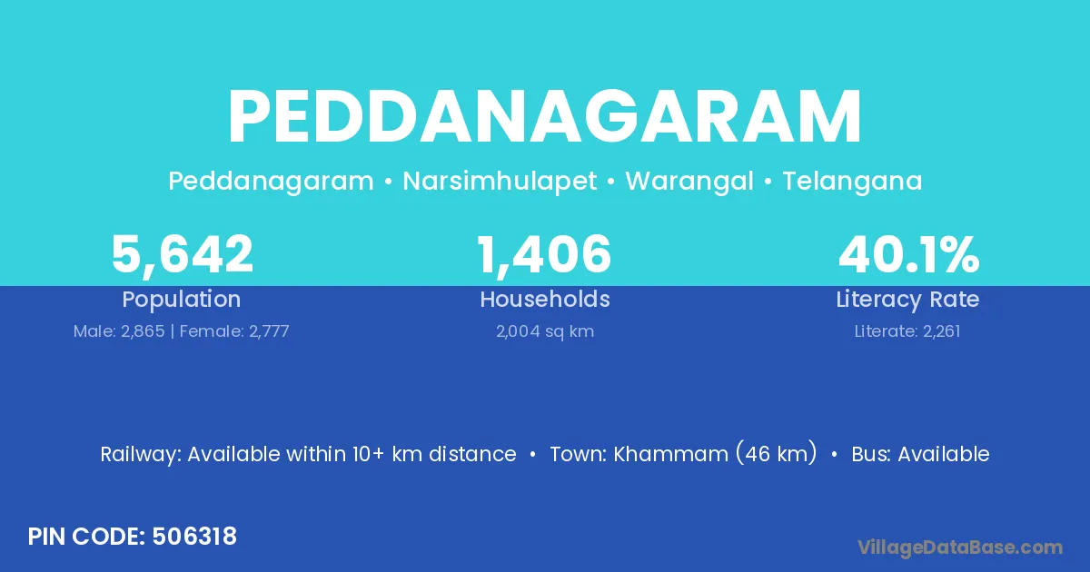 Khammam (46 km) is the nearest town to Peddanagaram village for major economic activities and is located approximately 46 km away.