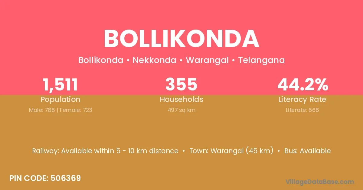 Warangal (45 km) is the nearest town to Bollikonda village for major economic activities and is located approximately 45 km away.