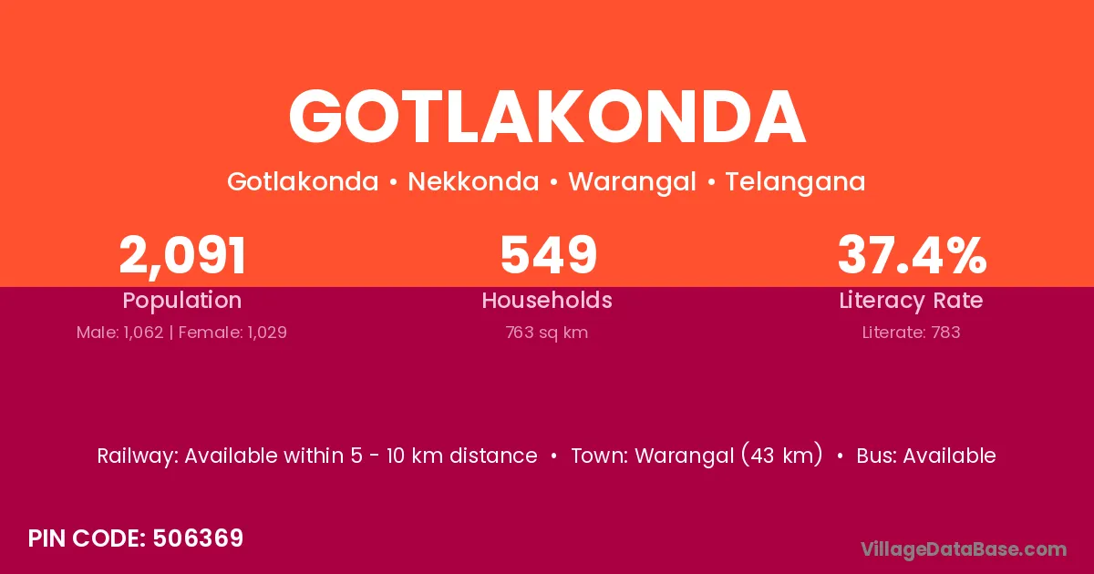Warangal (43 km) is the nearest town to Gotlakonda village for major economic activities and is located approximately 43 km away.