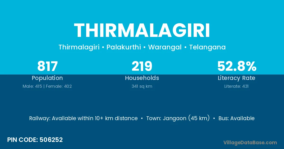 Jangaon (45 km) is the nearest town to Thirmalagiri village for major economic activities and is located approximately 45 km away.