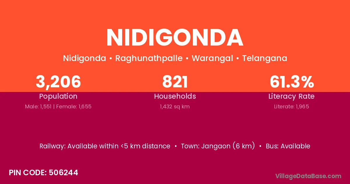 Jangaon (6 km) is the nearest town to Nidigonda village for major economic activities and is located approximately 6 km away.