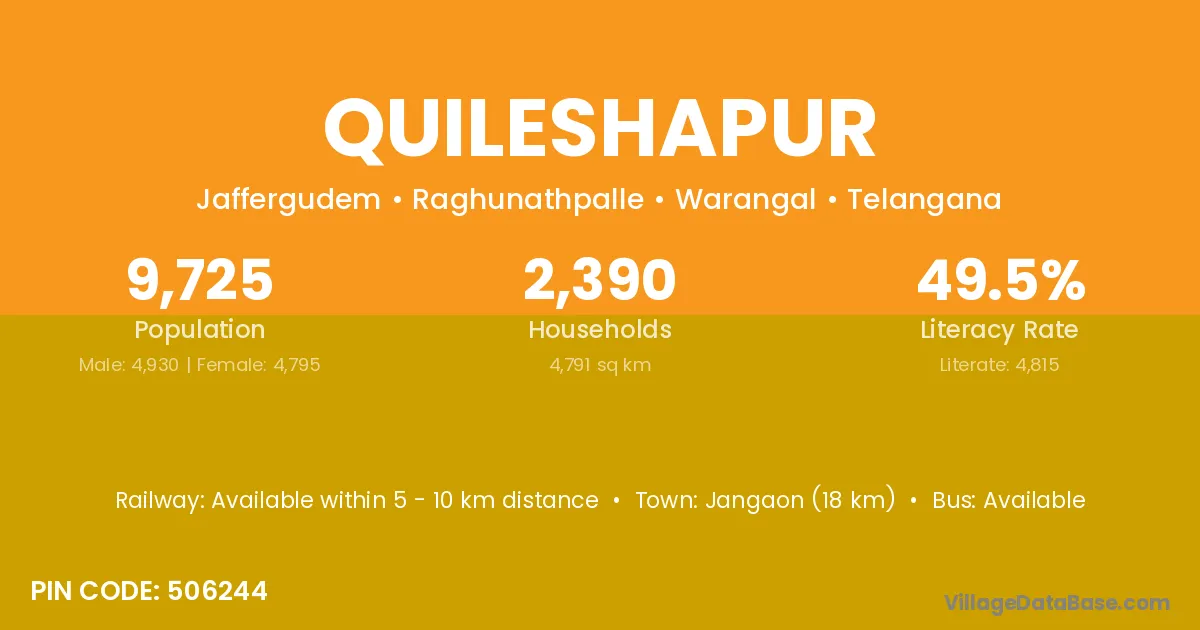 Jangaon (18 km) is the nearest town to Quileshapur village for major economic activities and is located approximately 18 km away.