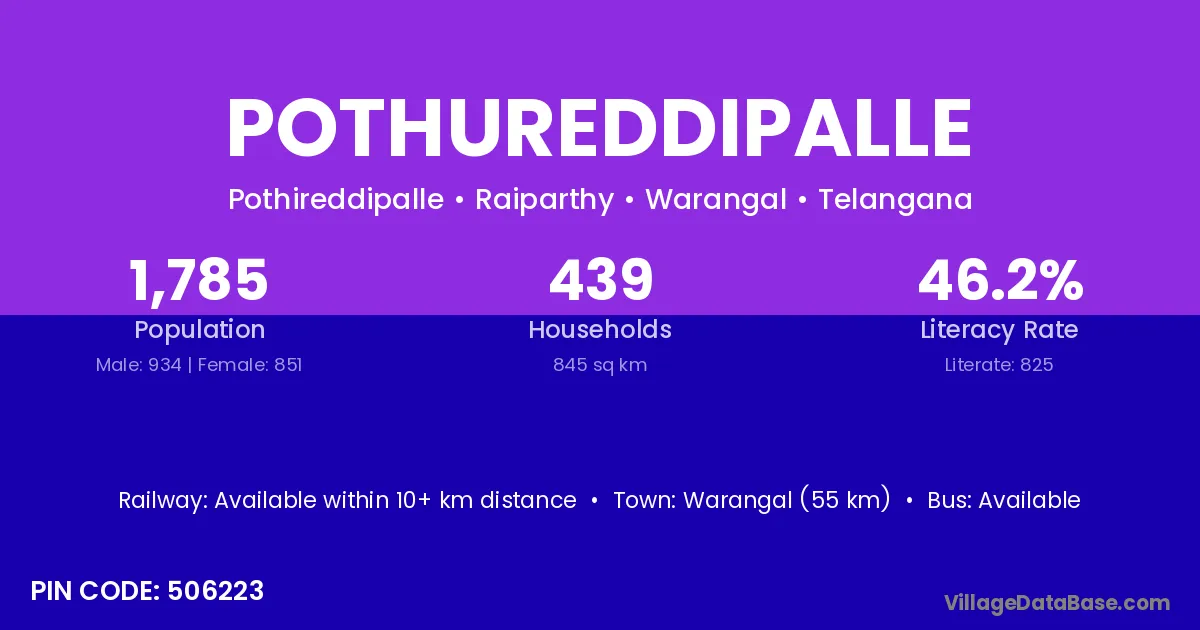 Warangal (55 km) is the nearest town to Pothureddipalle village for major economic activities and is located approximately 55 km away.