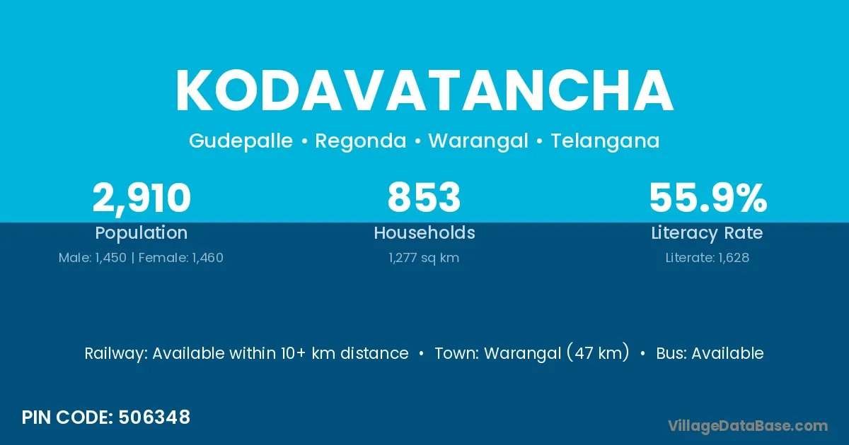 Warangal (47 km) is the nearest town to Kodavatancha village for major economic activities and is located approximately 47 km away.