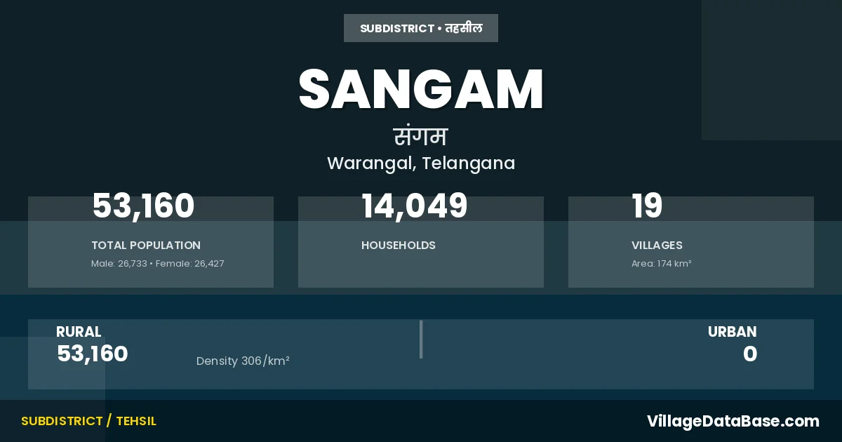 Sangam is a town and Mandal in the Warangal district of the Telangana. In India, a Mandal is a subdivision of a district responsible for the administration and revenue collection of a specific area within the district. Mandals play a crucial role in the local governance structure, contributing significantly to the development and administration of their communities.
