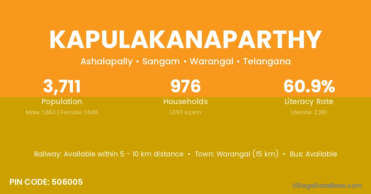 Warangal (15 km) is the nearest town to Kapulakanaparthy village for major economic activities and is located approximately 15 km away.