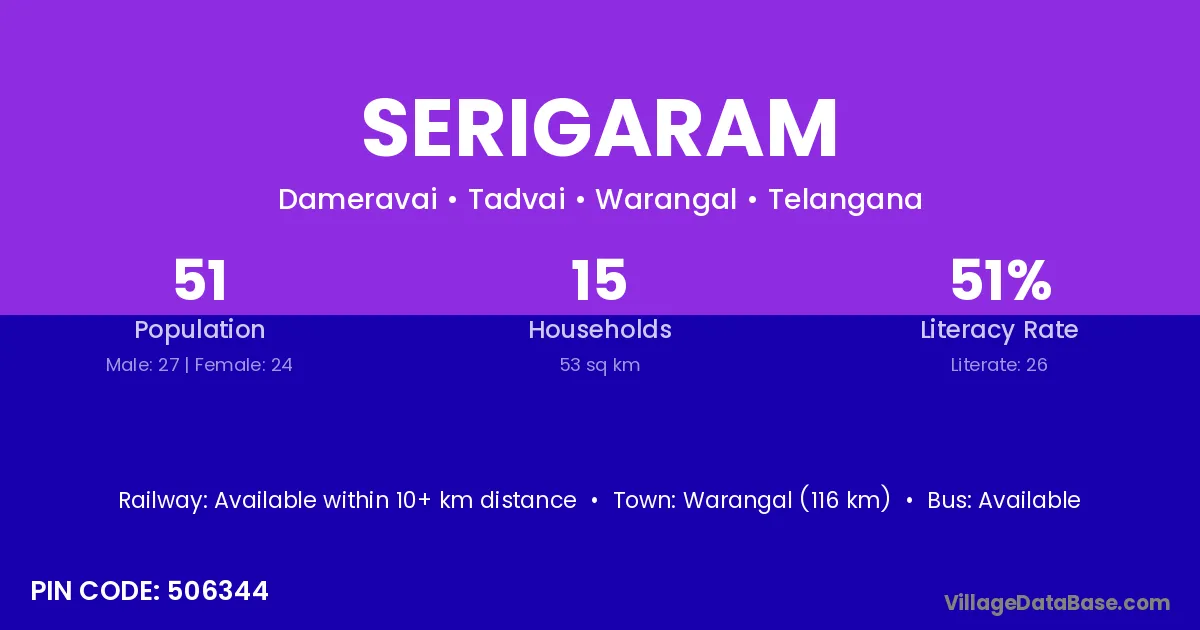 Warangal (116 km) is the nearest town to Serigaram village for major economic activities and is located approximately 116 km away.