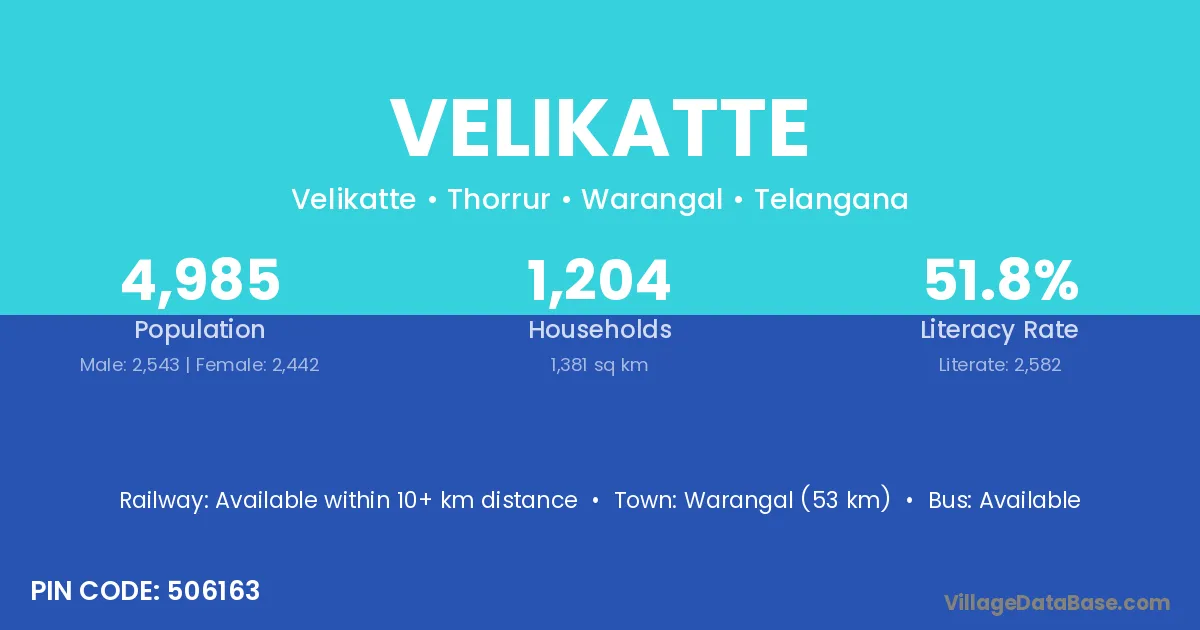 Warangal (53 km) is the nearest town to Velikatte village for major economic activities and is located approximately 53 km away.