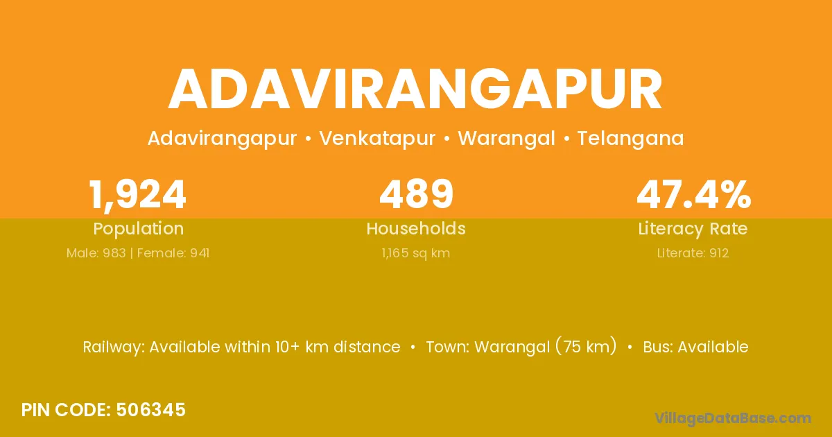 Warangal (75 km) is the nearest town to Adavirangapur village for major economic activities and is located approximately 75 km away.