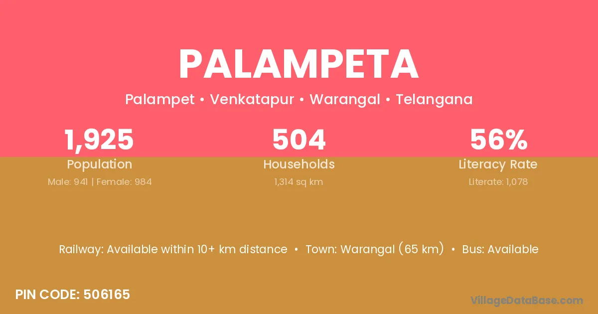 Warangal (65 km) is the nearest town to Palampeta village for major economic activities and is located approximately 65 km away.