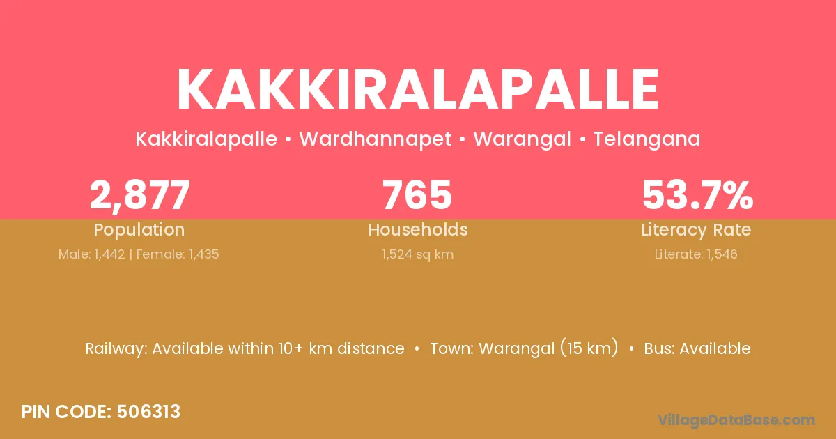 Warangal (15 km) is the nearest town to Kakkiralapalle village for major economic activities and is located approximately 15 km away.