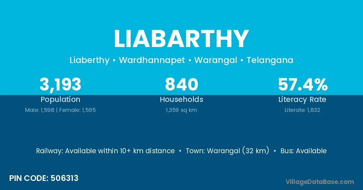 Warangal (32 km) is the nearest town to Liabarthy village for major economic activities and is located approximately 32 km away.