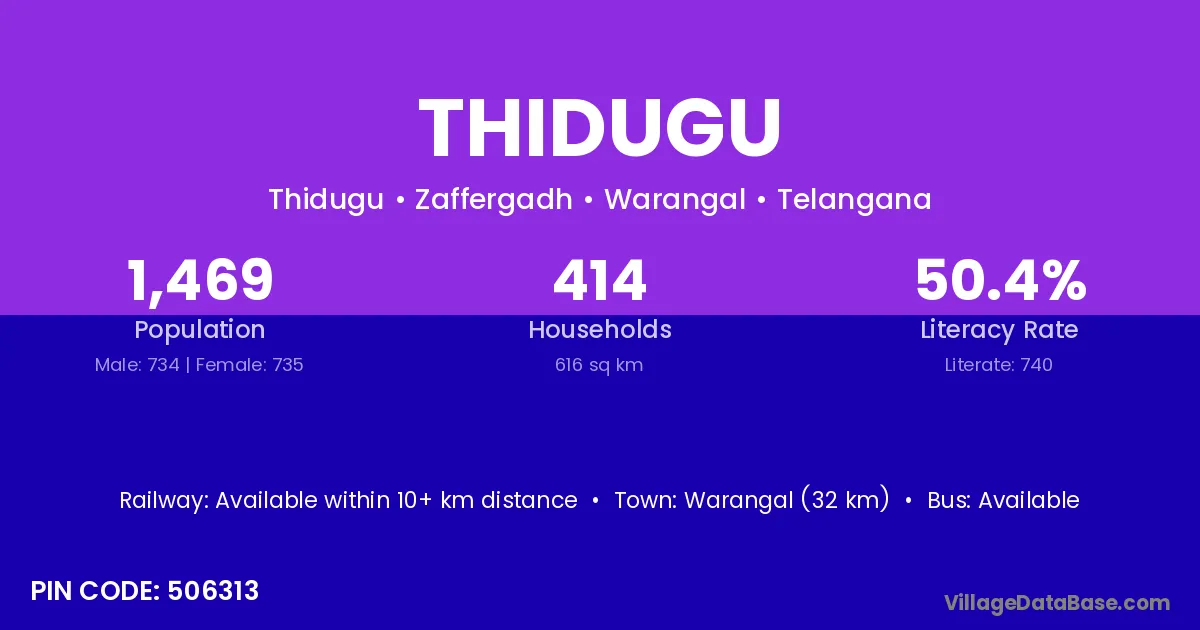 Warangal (32 km) is the nearest town to Thidugu village for major economic activities and is located approximately 32 km away.