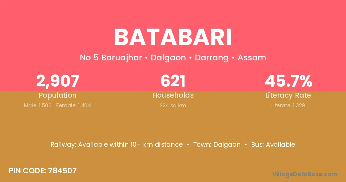 The literacy rate of Batabari village is 72.36%. Male literacy stands at 71.43% and female literacy at 73.47%.