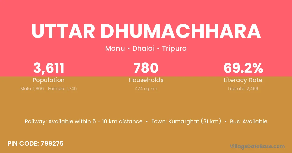 Kumarghat (31 km) is the nearest town to Uttar Dhumachhara village for major economic activities and is located approximately 31 km away.