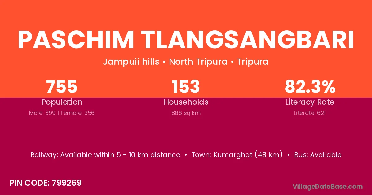 Kumarghat (48 km) is the nearest town to Paschim Tlangsangbari village for major economic activities and is located approximately 48 km away.