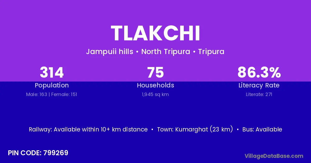 Kumarghat (23 km) is the nearest town to Tlakchi village for major economic activities and is located approximately 23 km away.