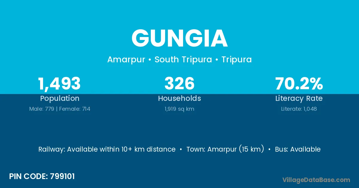 Amarpur (15 km) is the nearest town to Gungia village for major economic activities and is located approximately 15 km away.