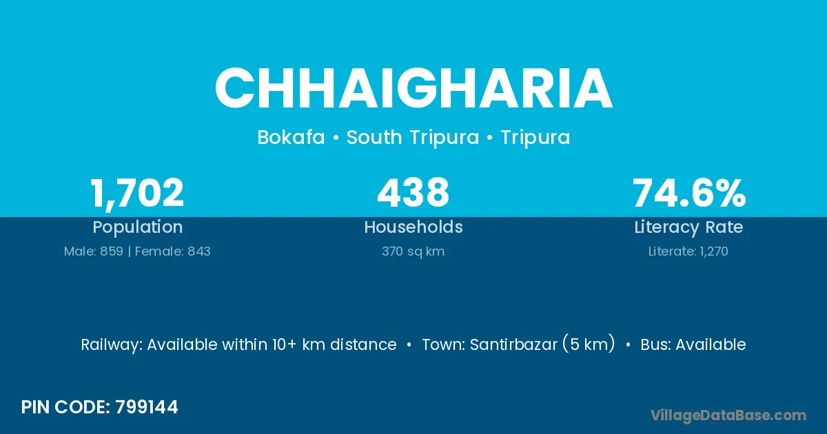 According to Census 2011 information, the village code of Chhaigharia village is 799144.