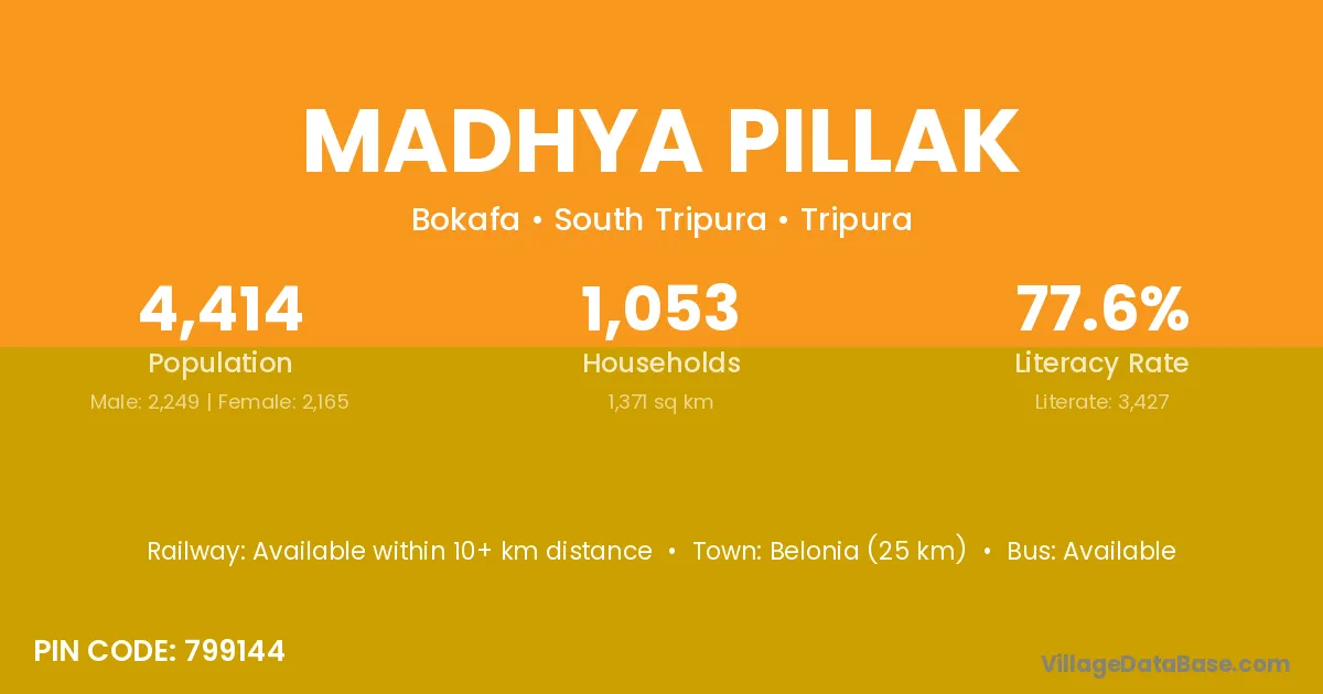 Belonia (25 km) is the nearest town to Madhya Pillak village for major economic activities and is located approximately 25 km away.