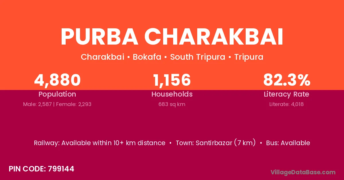 Santirbazar (7 km) is the nearest town to Purba Charakbai village for major economic activities and is located approximately 7 km away.