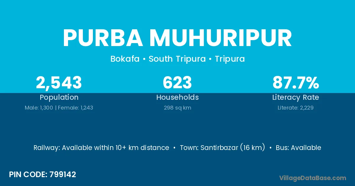 Purba Muhuripur village has a total population of 2,543 people, of which 1,300 are males and 1,243 are females.
