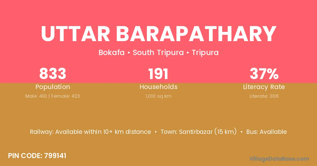 Uttar Barapathary village has a total population of 833 people, of which 410 are males and 423 are females.