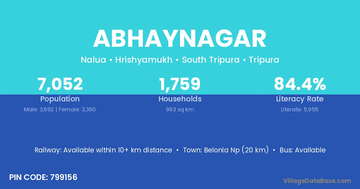 Belonia Np (20 km) is the nearest town to Abhaynagar village for major economic activities and is located approximately 20 km away.