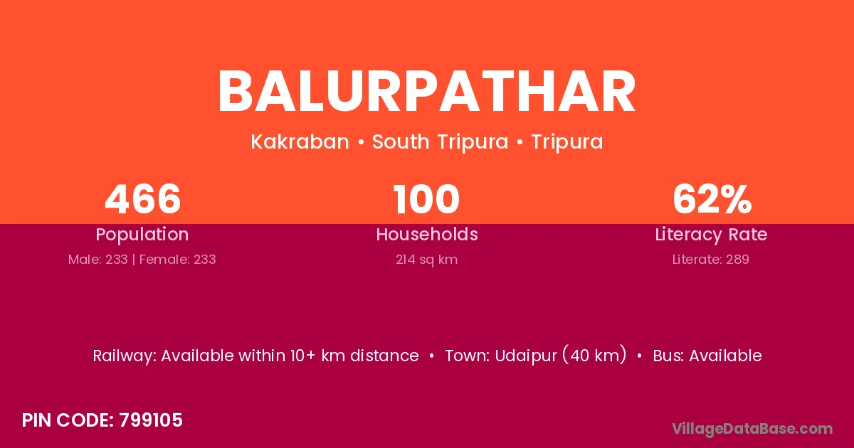 Udaipur (40 km) is the nearest town to Balurpathar village for major economic activities and is located approximately 40 km away.