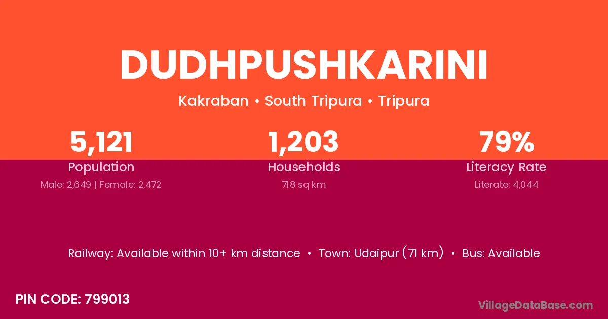 Udaipur (71 km) is the nearest town to Dudhpushkarini village for major economic activities and is located approximately 71 km away.