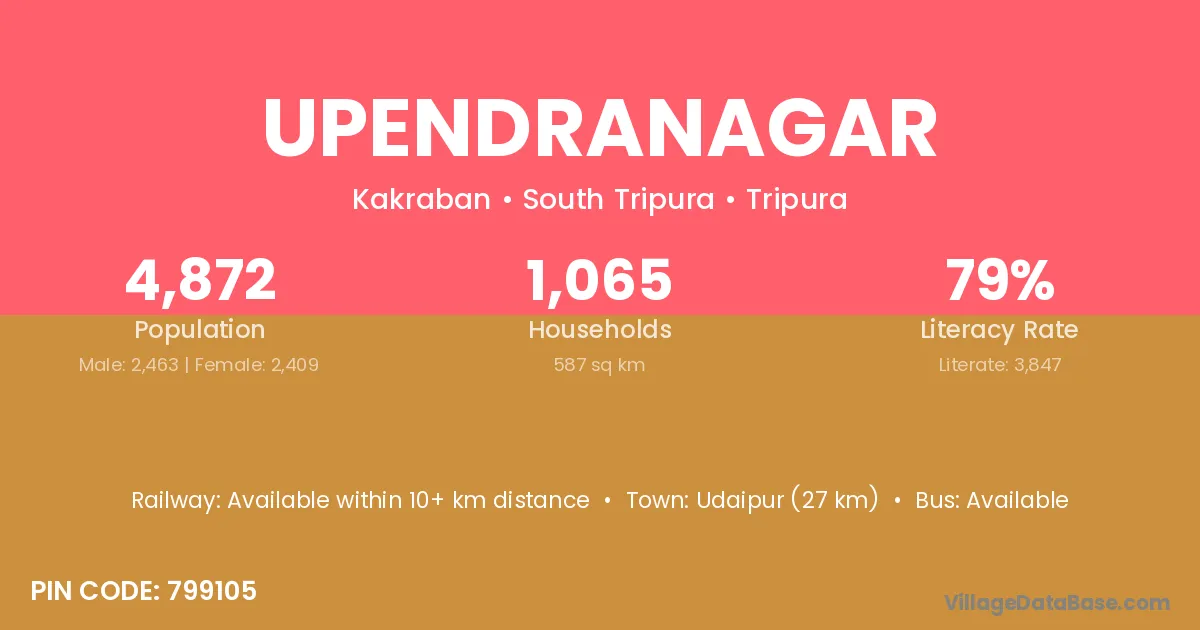 Udaipur (27 km) is the nearest town to Upendranagar village for major economic activities and is located approximately 27 km away.