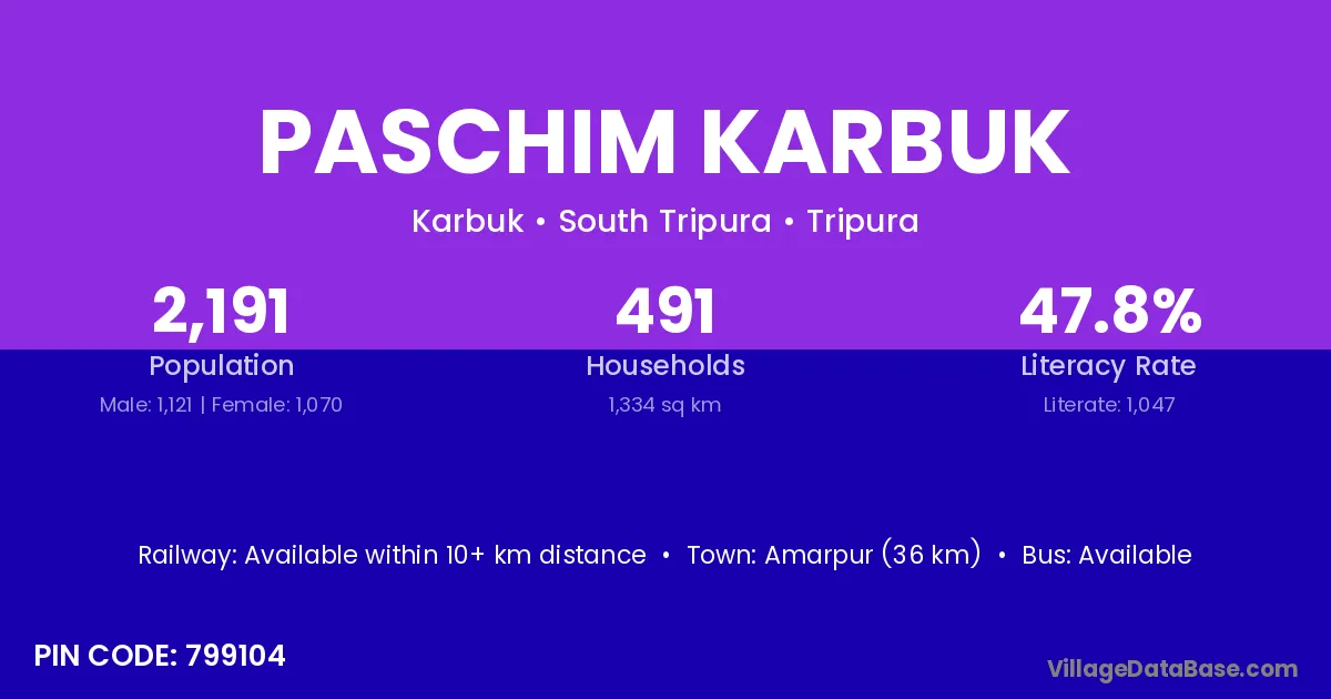 Amarpur (36 km) is the nearest town to Paschim Karbuk village for major economic activities and is located approximately 36 km away.