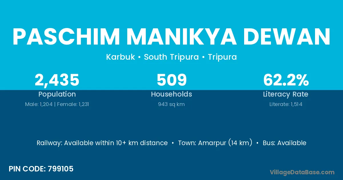 Paschim Manikya Dewan village has a total population of 2,435 people, of which 1,204 are males and 1,231 are females.