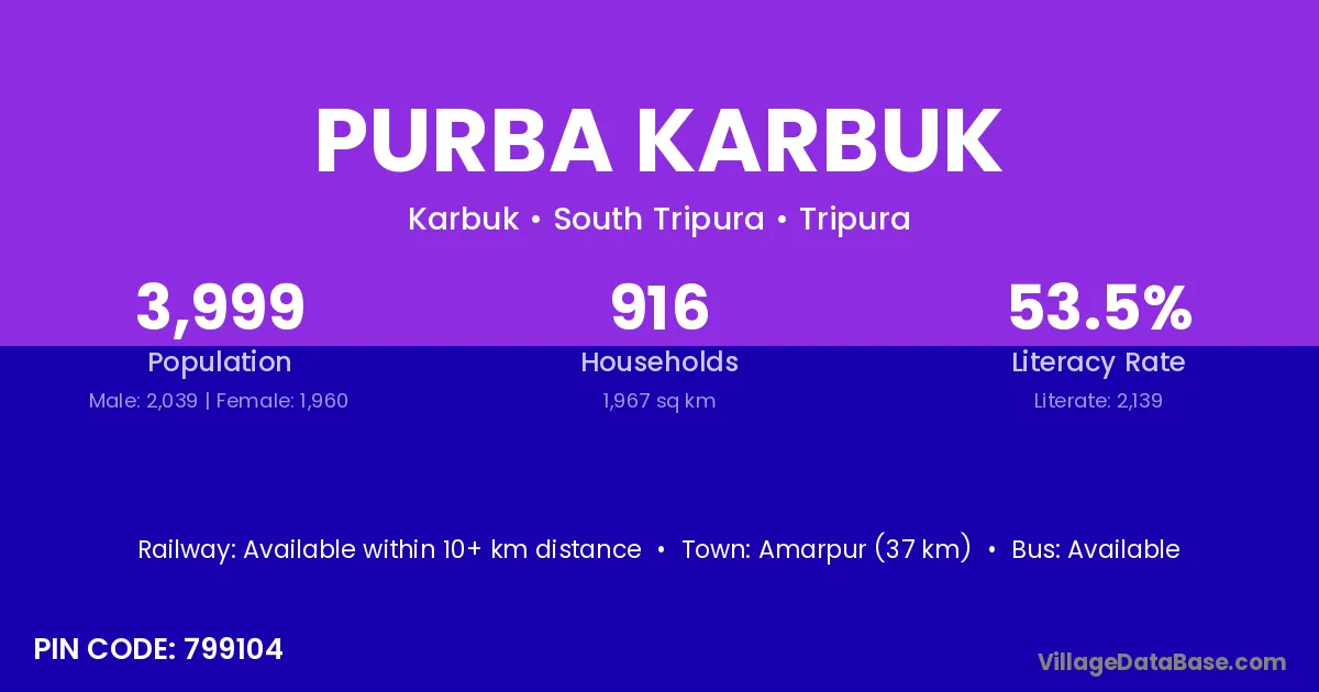 Amarpur (37 km) is the nearest town to Purba Karbuk village for major economic activities and is located approximately 37 km away.