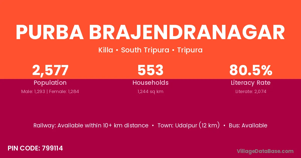 Purba Brajendranagar village has a total population of 2,577 people, of which 1,293 are males and 1,284 are females.