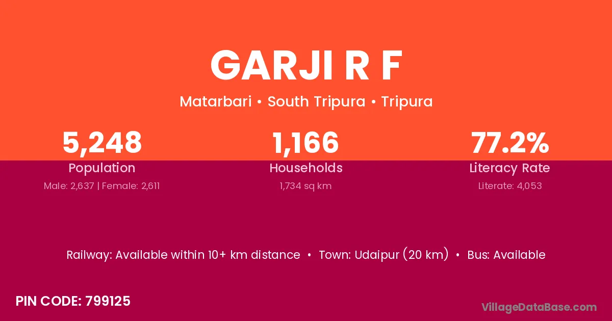 Garji R F village has a total population of 5,248 people, of which 2,637 are males and 2,611 are females.