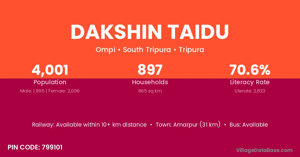 Dakshin Taidu village has a total population of 4,001 people, of which 1,995 are males and 2,006 are females.