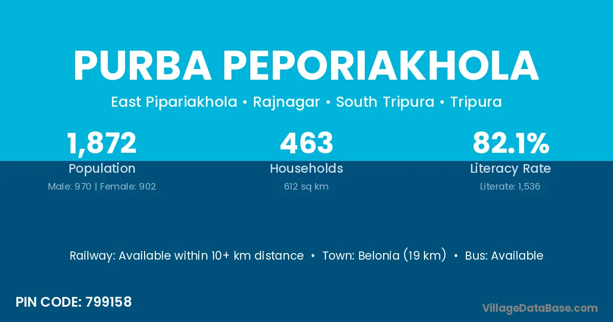 Belonia (19 km) is the nearest town to Purba Peporiakhola village for major economic activities and is located approximately 19 km away.