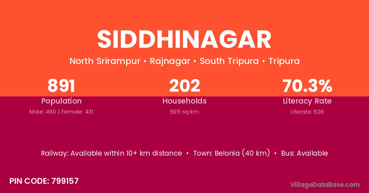 Belonia (40 km) is the nearest town to Siddhinagar village for major economic activities and is located approximately 40 km away.