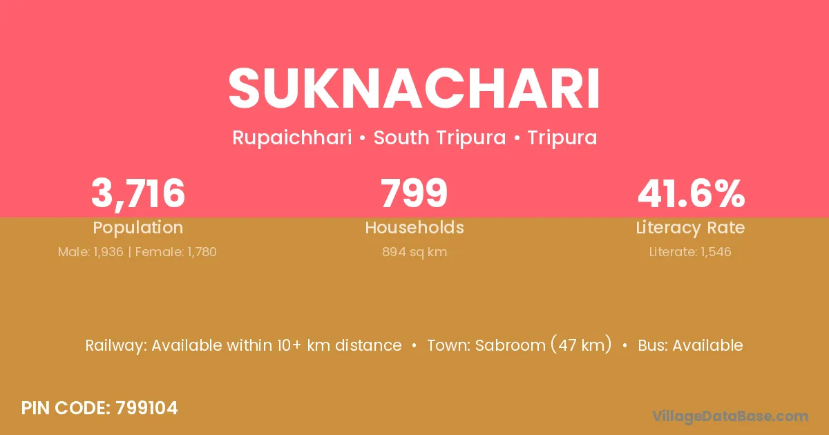 Sabroom (47 km) is the nearest town to Suknachari village for major economic activities and is located approximately 47 km away.