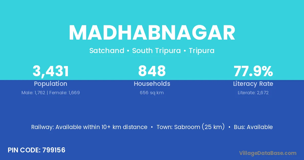 Sabroom (25 km) is the nearest town to Madhabnagar village for major economic activities and is located approximately 25 km away.