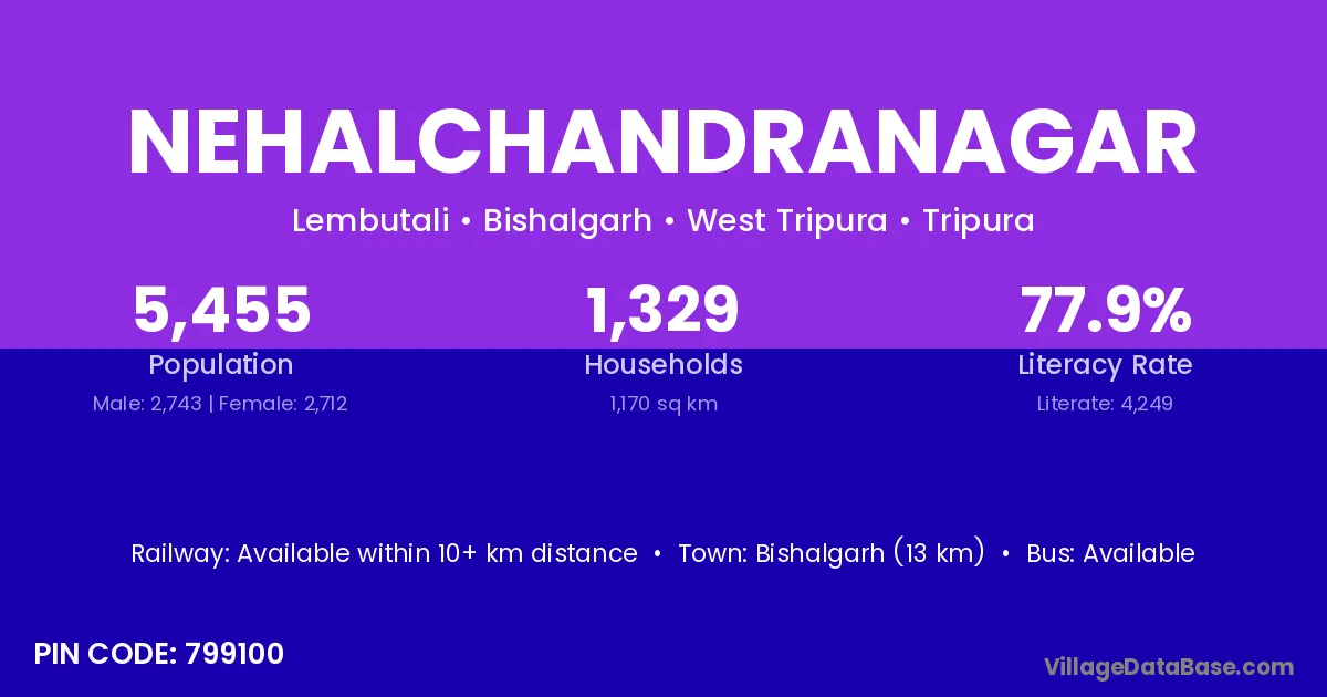 Bishalgarh (13 km) is the nearest town to Nehalchandranagar village for major economic activities and is located approximately 13 km away.