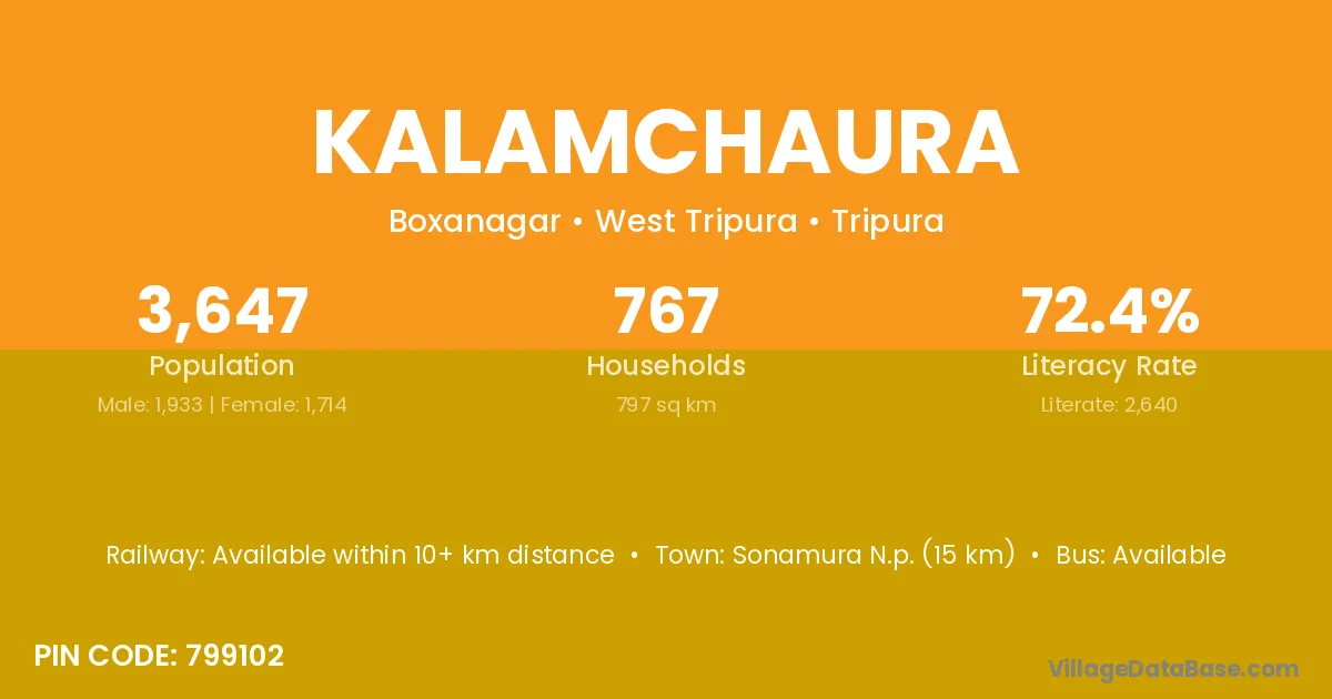 Sonamura N.p. (15 km) is the nearest town to Kalamchaura village for major economic activities and is located approximately 15 km away.