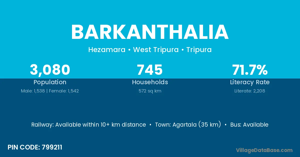 Agartala (35 km) is the nearest town to Barkanthalia village for major economic activities and is located approximately 35 km away.