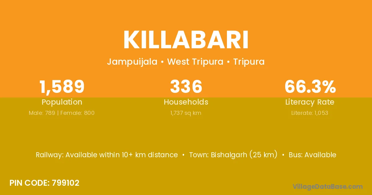Bishalgarh (25 km) is the nearest town to Killabari village for major economic activities and is located approximately 25 km away.